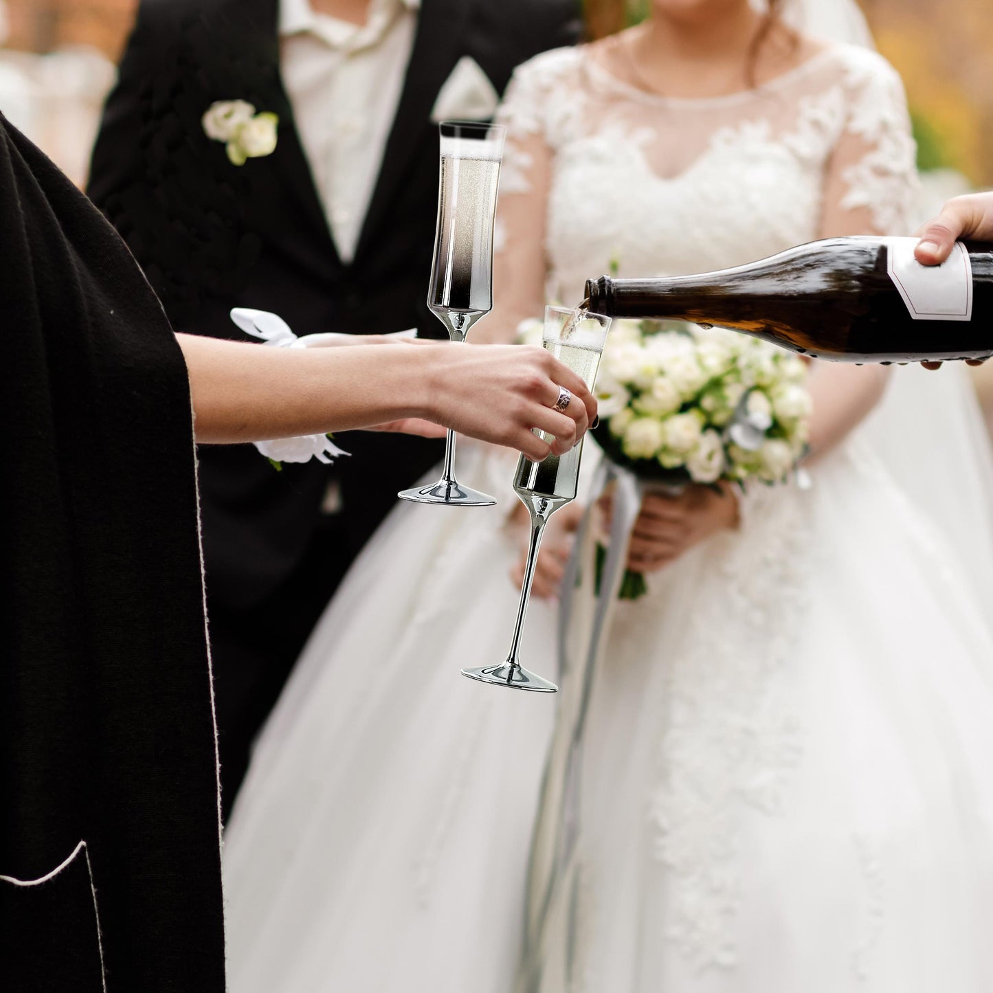 After saying ”Yes!”, the newlyweds toast each other with champagne and celebrate the beginning of their new life together. This unique glassware set highlights this special celebration of love, commemorating an unforgettable moment. The set is designed especially for newly married couples and features elegant, customized
